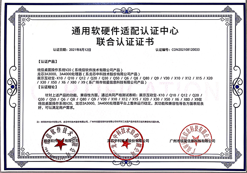 統信認證證書(展示互動寶、無線微錄儀)
