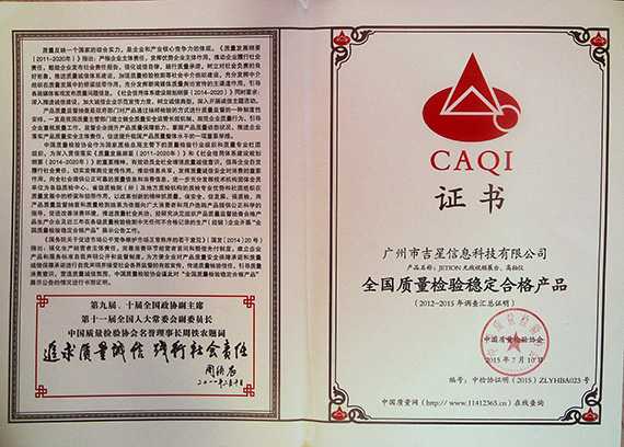 經中國質量檢驗協會評定,吉星信息科技有限公司無線視頻展臺、高拍儀系列產品憑借其質量過硬、信譽良好獲“全國質量檢驗穩定合格產品”稱號。